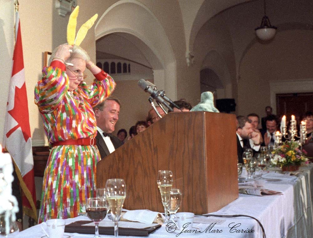 GG Jeanne Sauvé jokingly wears rabbit ears, as PM Brian Mulroney bringing all to laughter during Parliamentary Press Gallery Dinner, - photo © Jean-Marc Carisse 1986