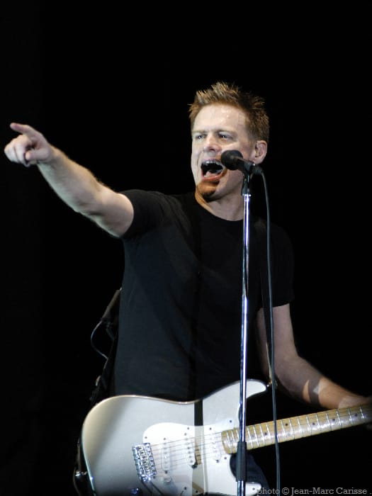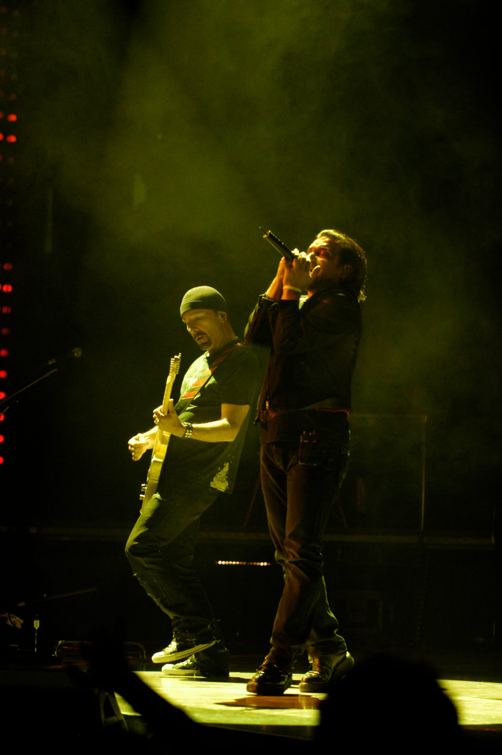 U2 with Bono (right) and Edge (a.k.a. David Howell Evans) perform at the Canadian Tire Centre, photo © Jean-Marc Carisse 2005