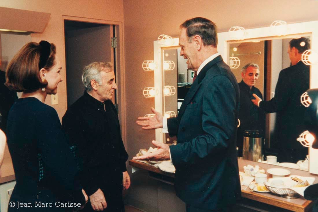 Charles Aznavour, PM Jean Chrétien & wife Aline meet in the French singer's dressing room at the N.A.C. in 1996. photo © Jean-Marc Carisse