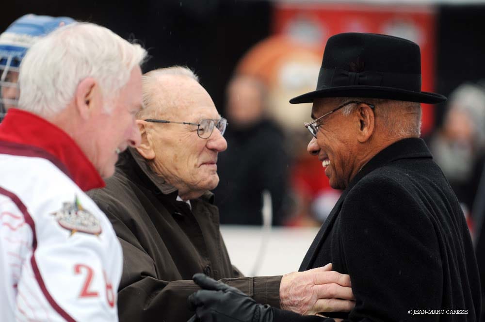 Johnny Bower greets Willie O'Ree, first black NHL player, as GG David Johnston looks on, photo_©_Jean-Marc_Carisse_2012