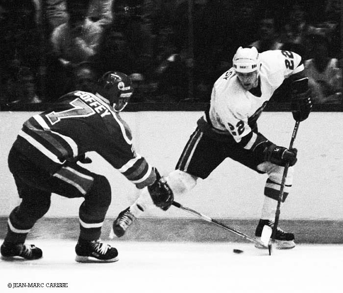 NHL Playoffs, Meadowlands Arena, Long Island, NY, Paul Coffey & Mike Bossy, photo © Jean-Marc Carisse 1987