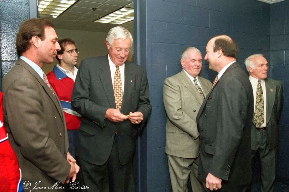 Montreal Canadiens stars gather for opening ceremony at the new Molson (now Bell) Centre, L-R: Guy Lafleur, Jean Béliveau, Maurice Richard, Steve Shutt, Henri Richard, - photo © Jean-Marc Carisse 1996 03 16