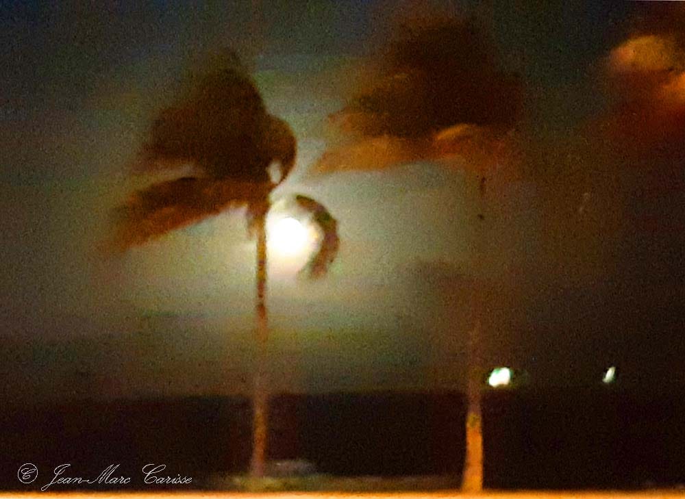 Southern Florida palm trees embrace a full moon on a windy evening. photo © Jean-Marc Carisse 2020